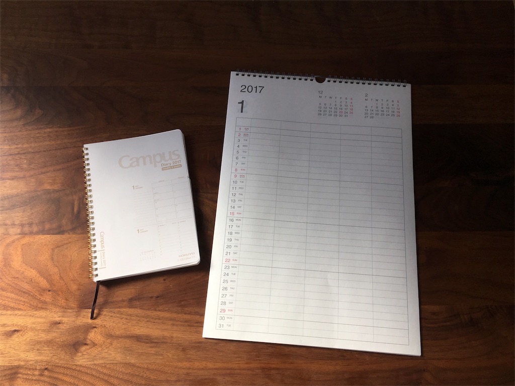 手帳は去年同様をリピート。カレンダーは無印良品のファミリーカレンダーにしました。