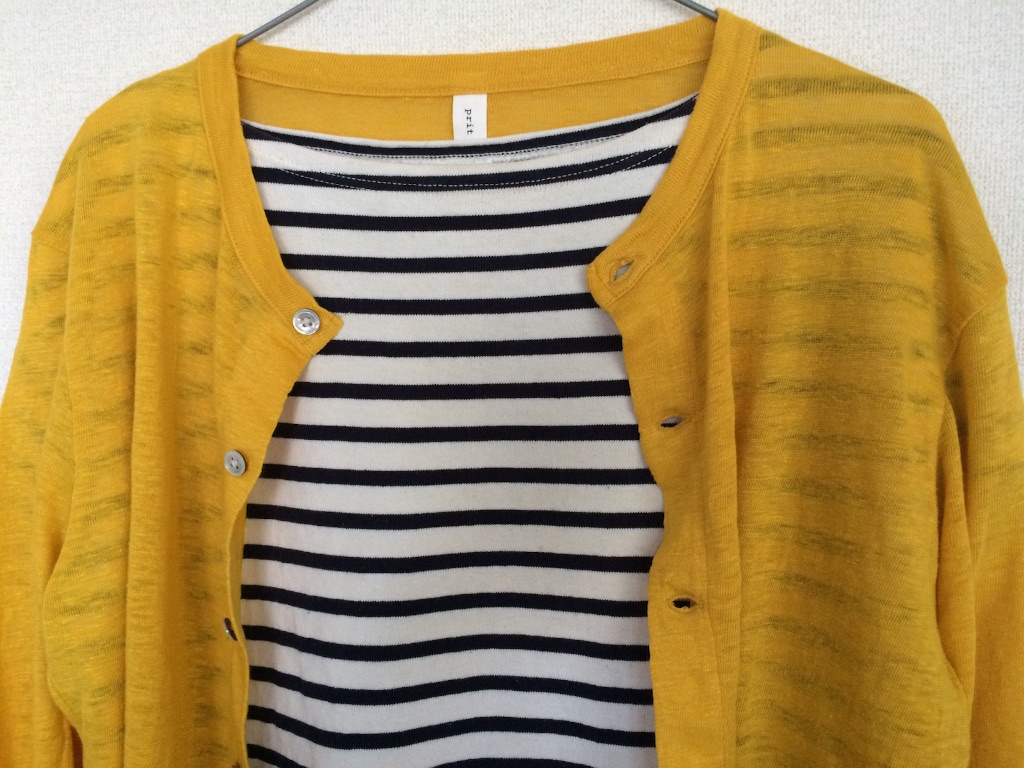赤、青はユニクロ、黄色は七分袖リネン100%なので夏でも涼しいです。