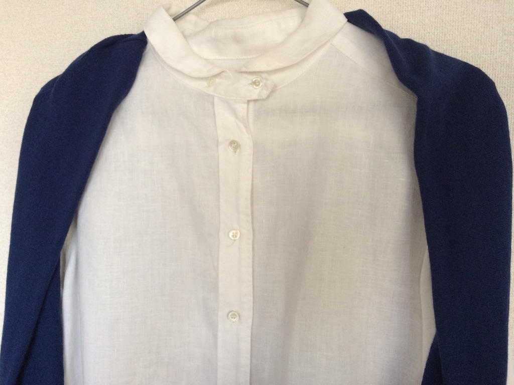 襟とカーディガンの首回りのバランスが