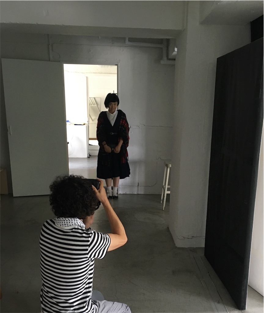 外は真夏なのに、ファッションはもう秋冬の撮影。