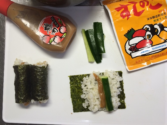 酢めしを冷まして、キュウリと梅肉で巻いてます。