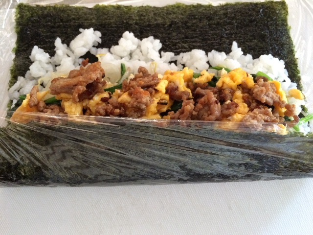 ひき肉は炒めて焼肉のたれで味付け。単品で食べて濃すぎる!と思うぐらいの味付けが海苔巻きにはちょうどいい。