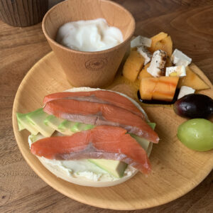 あとは、下の写真ですが、メープル味の少し甘めのベーグルにはクリームチーズと柿をサンドして。もしプレーンベーグルの場合はメープルシロップをたらりとしても。