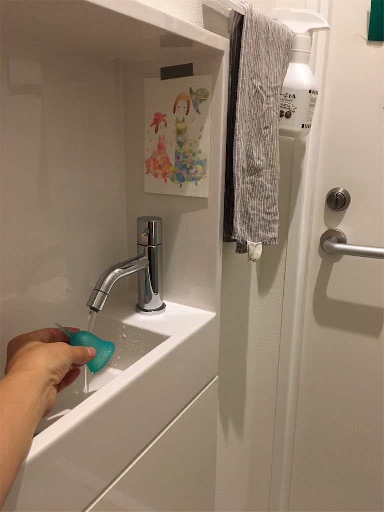 ちなみに、スクーンカップは、座りながらここで洗っています。生理用品のストックを持たないだけでトイレすっきり!