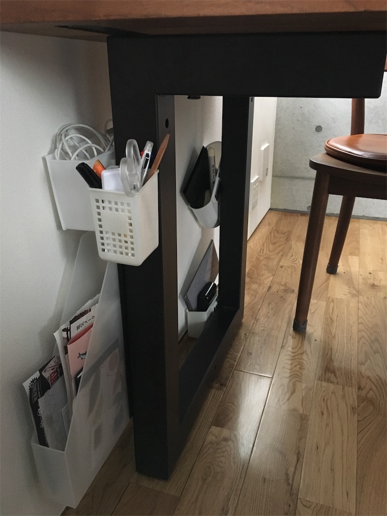 だから座ったままで色々作業できるようにテーブルの下に磁石で小物を貼りつけています。