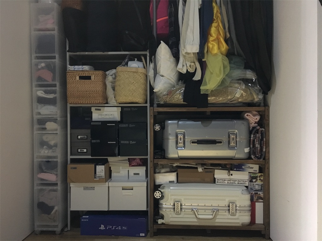 つくりが丈夫なので重い物を乗せてもへっちゃら。現在はクローゼットの奥で縁の下の力持ちのように活躍してくれています!こちらは無印のユニットシェルフの裏側、ブログでは初公開。普段使わない物を収納しておく場所です。