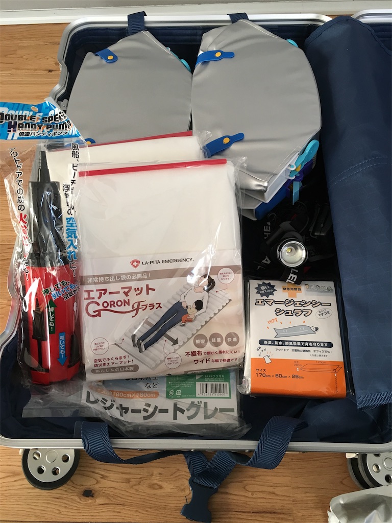 折りたたみ式のヘルメットを家族分と、エアーマットや防寒グッズなど。