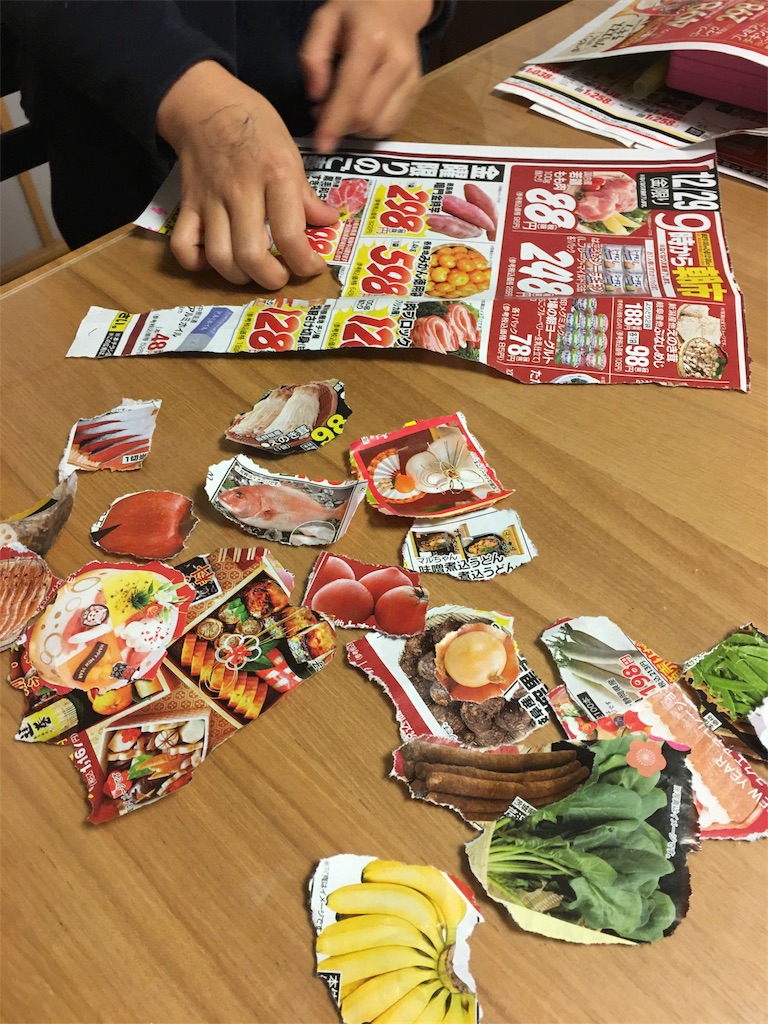 広告をちぎってお店やさんごっこ。ハサミを使いこなせるようになってしまうと、ちぎることがうまくできないんです。最初はハサミのようにイメージ通りにちぎれなかったけど、何度も練習するうちになんとなくコツをつかめるように。