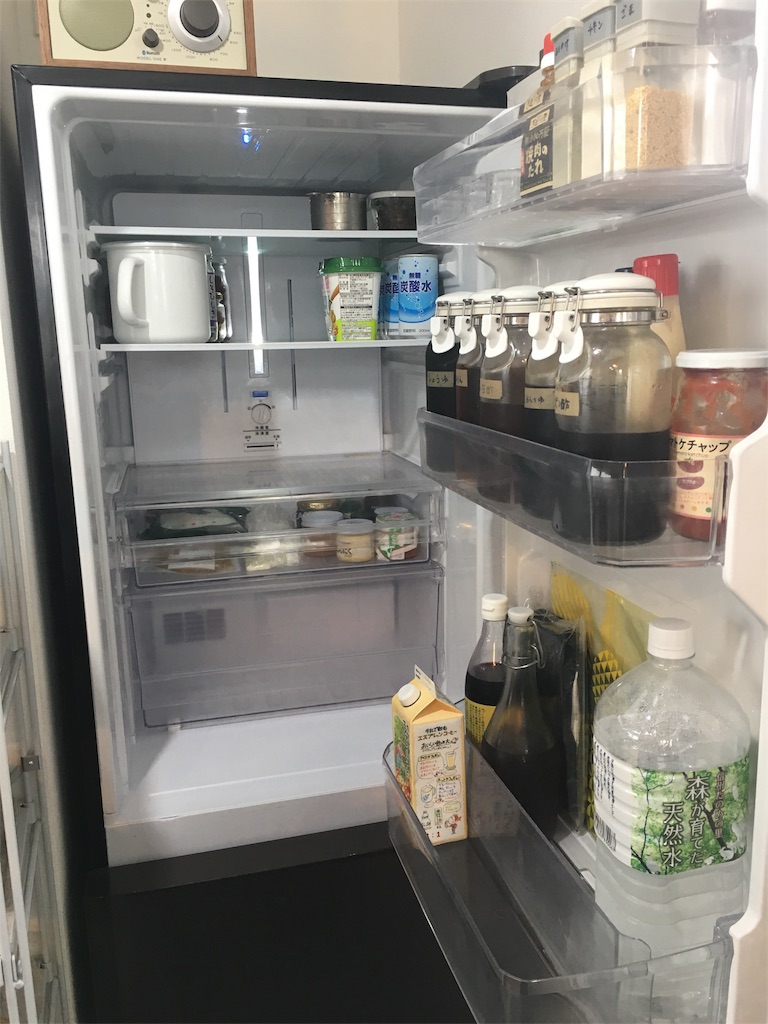 マキさん宅の旅行前の冷蔵庫、ガラガラで素晴らしい!我が家もなるべく使い切ろうとしましたが、こんなスッキリとはいきませんでした(><)