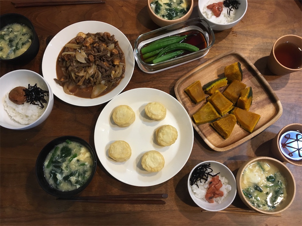 冷蔵庫がガラガラになる前の日の晩ごはん。乾物のお麩を使ったり(牛肉の炒め物の中)、つくりおきしていたオクラを食べ切ったり、冷凍庫野菜のカボチャを蒸したりして何とか買い足さずに食べきる。