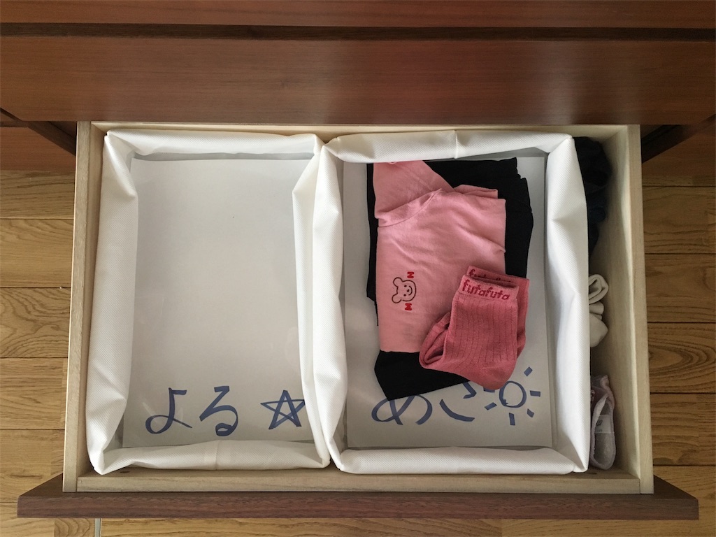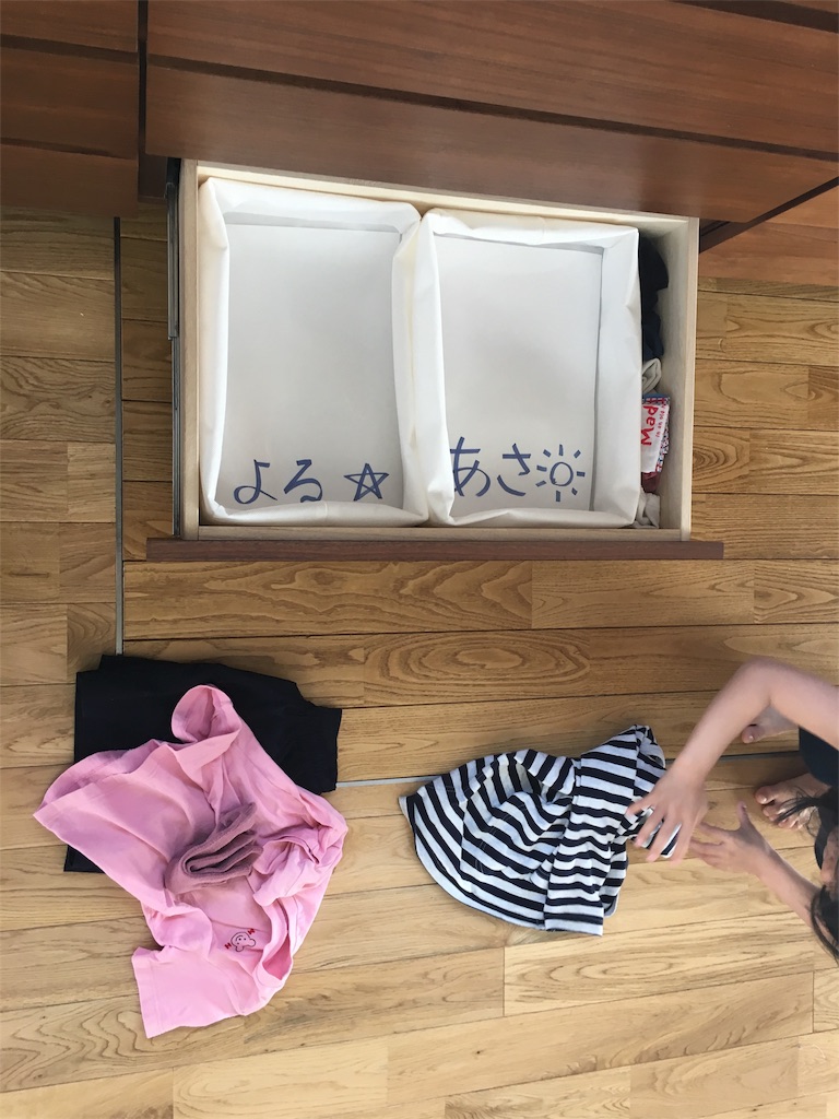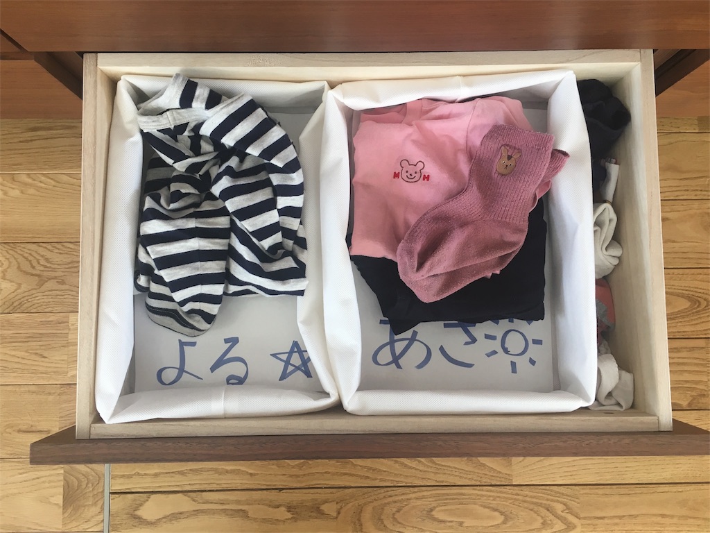 自分専用の引き出しを開けると「あさ」と「よる」着るのもがひと目でわかります。