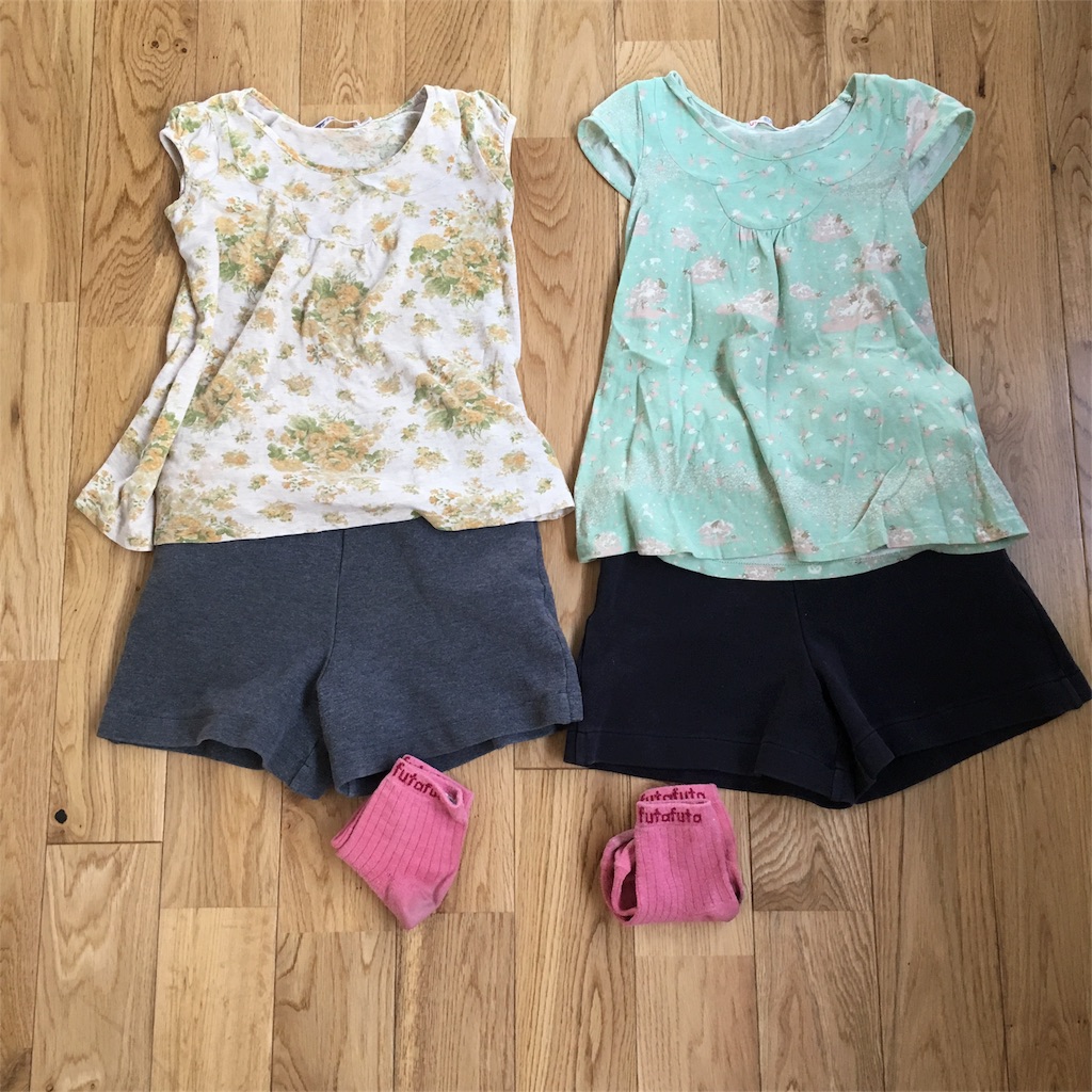 普段着の夏バージョン。もうすこし暑くなったらこの薄いTシャツを出します。これは6年ぐらい前のユニクロ。チュニックだと約3年間と長く着れるんです。これは110サイズでしたが、3歳の頃はワンピース、4歳はチュニックで、5歳の今はTシャツとして。娘たちは、縦にしか伸びなかったので可能だった特殊な方法ですが。