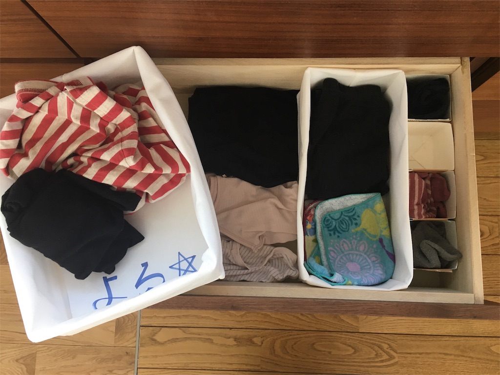 ワタシの引き出し。基本的に日中は空っぽ。洗濯物を取り込んだときにここにお風呂から出たあとに着る下着などを入れます。基本は2セット持ちで、予備が左隅に入ってますがほぼ出番なし。