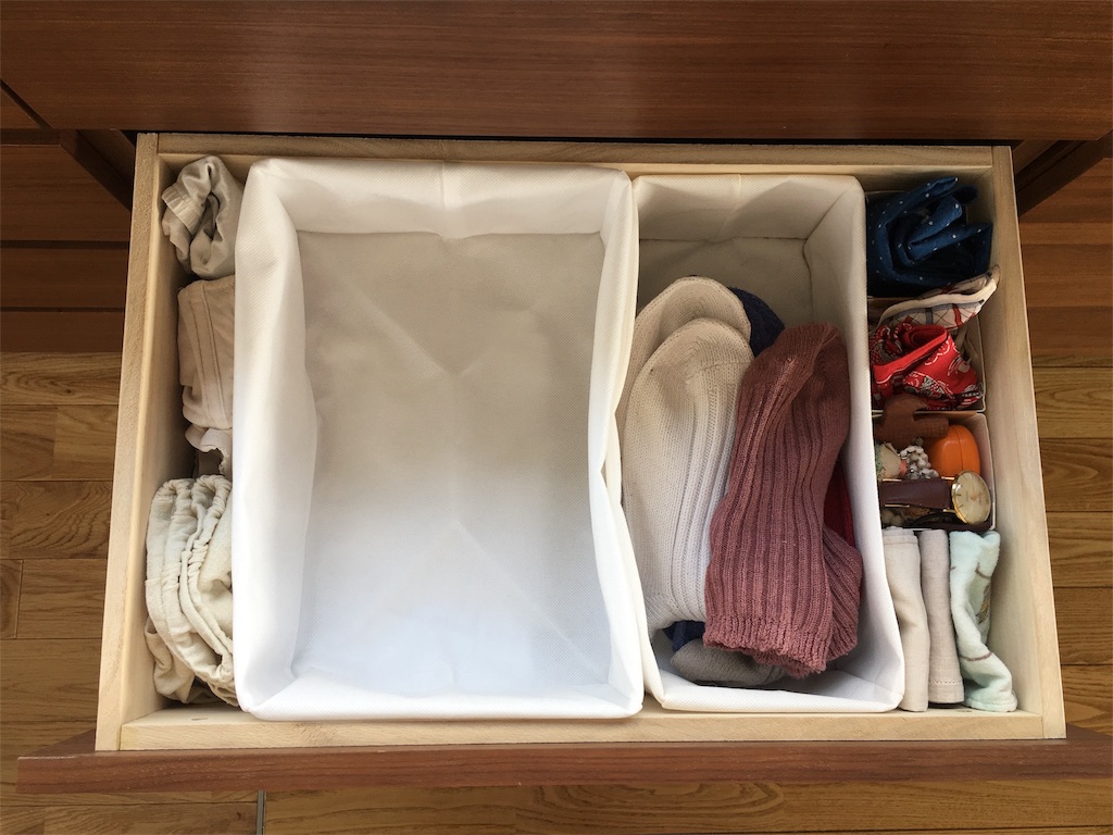 服の2セット持ちは、収納まで簡単にします。乾いて取り込んだ昨日の洗濯物一式(Tシャツ、半ズボン、下着、靴下)をこの引き出しにふんわり入れれば次の日の準備が完了します。