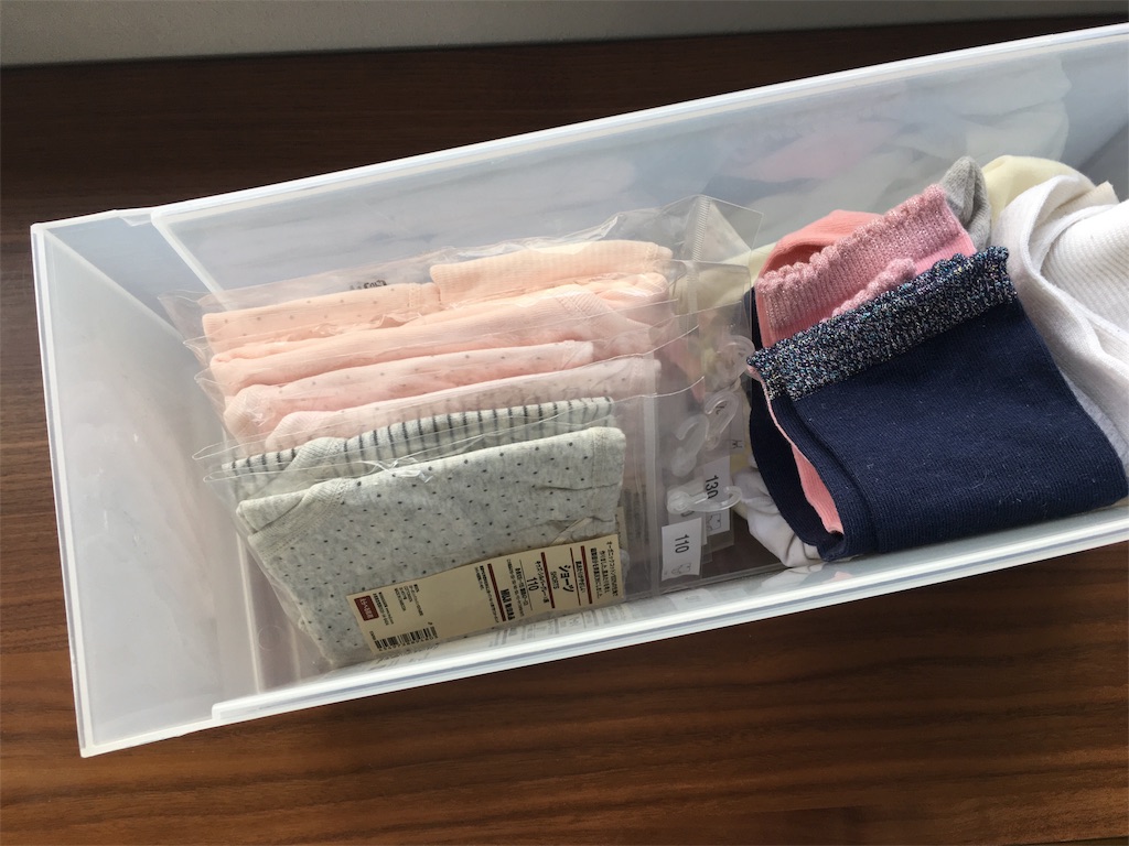 こっちは長女。長女の洋服はクローゼットにハンガー収納なので、ここは下着や靴下、ハンカチなど。下着は基本の2セットがあり、予備がケースの下あります。