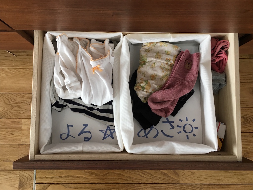 ちなみに、寝るときにパジャマは畳んで(ピシッとキレイに畳むまでは求めず )、「よる」に入れればオッケーとしています。