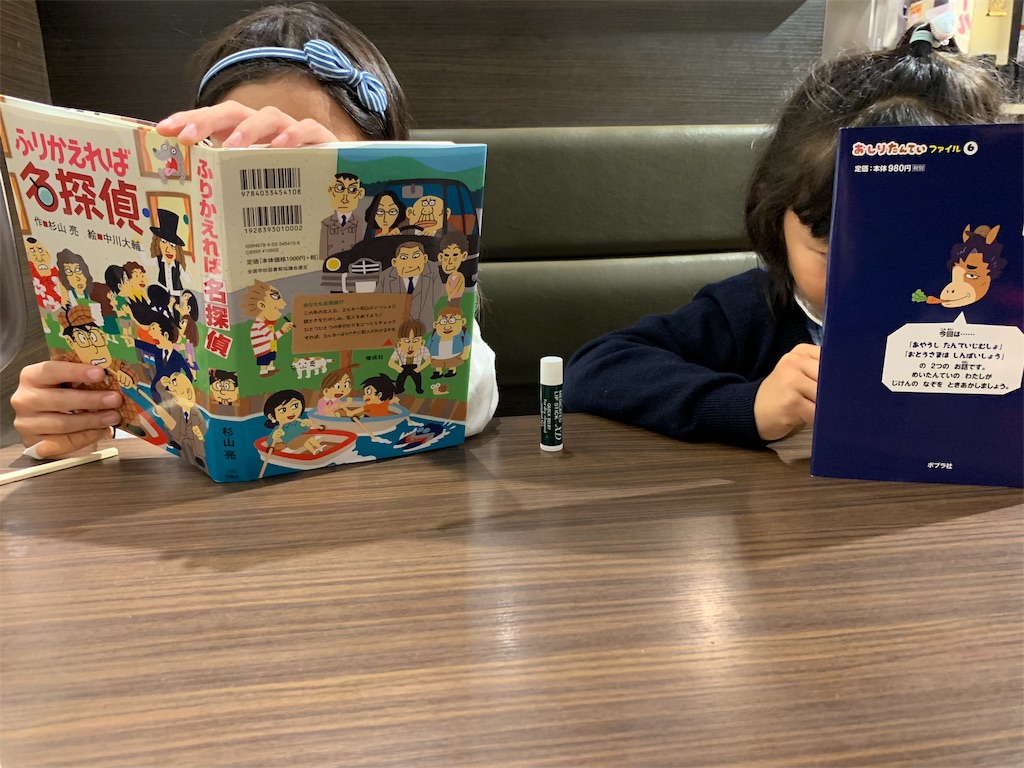 この日は本屋さんで2人とも探偵の本を選んでました。さっそくご飯が運ばれてくるまでの読書タイム。まだ次女は読み聞かせをしているけど、こんな感じで文字を目で追って1人でも読めるようにもなってきたので移動中とかも静かになりました。