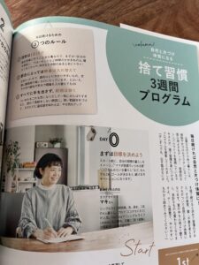 わたしがご機嫌でいられる家事@ESSE Special わたしがご機嫌でいられる家事に掲載いただきました。 以前、ESSEで大反響だった「捨て習慣3週間プログラム」の再掲載です。 1日10分を目安に、1日1箇所、捨て習慣を身につけることができるプログラムを4ページにわたってご紹介しています。 誰でも無料で簡単にできることなので、ぜひ捨てるのが苦手な方は参考にしていただければと思います。