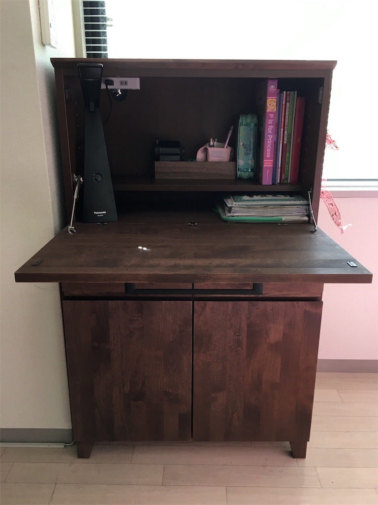 一応前もって長女に、机はこんなのはどうかな?と聞いたとき、いいね〜とお墨付きをもらえたのはお友達の家がライティングビューローだったからだと思います。