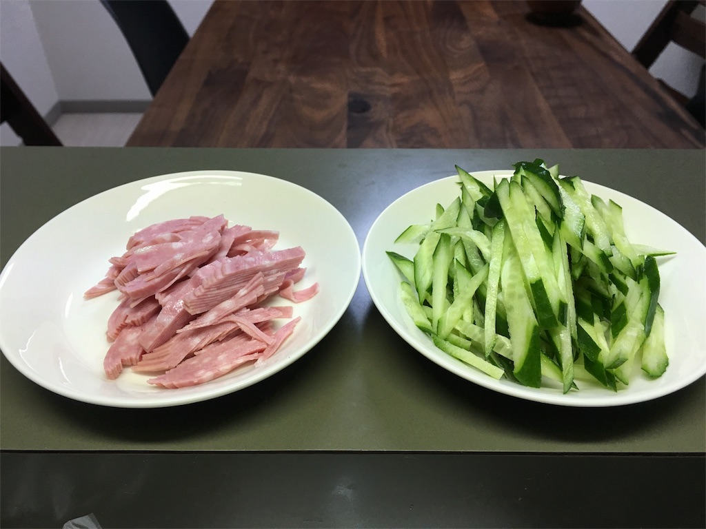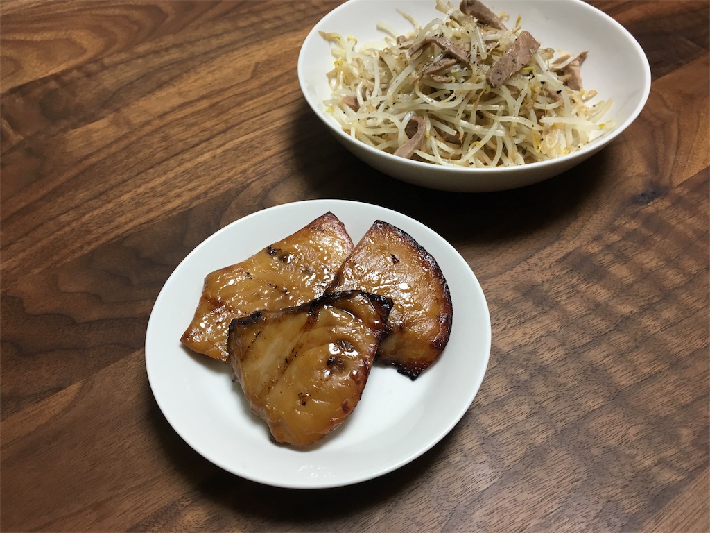 晩ごはんのとき、魚の切り身を盛ってみたり。チャーシューもやし炒めのお皿は無印良品。