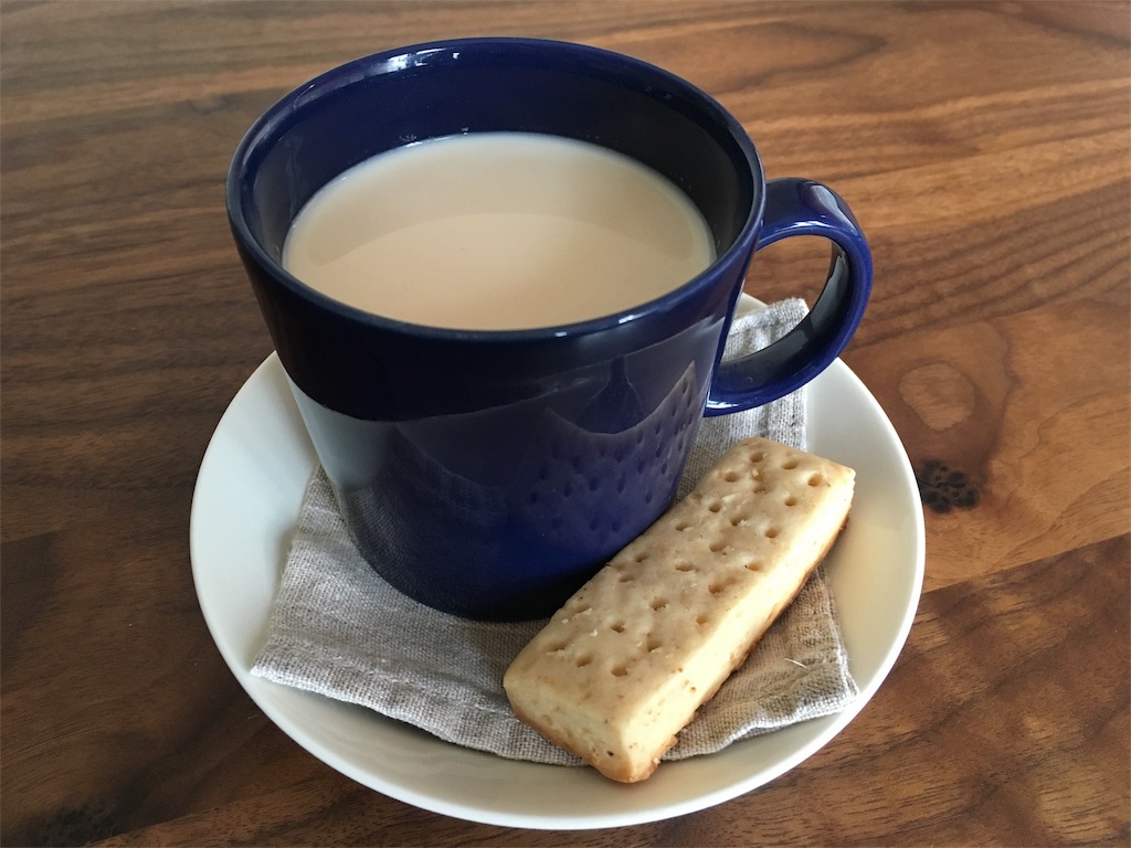 ブルーのマグのときも。ミルクティーと、自家製のきなことおからのショートブレッド。