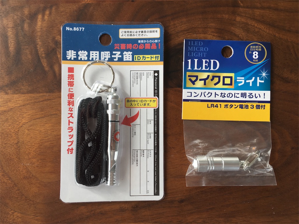 これは100円ショップのものですが、いざというときは役に立つから、災害アドバイザーの方が絶対持ち歩いておいたほうがいいと言っていたので。