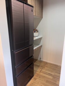 また、キッチン奥のパントリーも死角で色々隠せちゃうからかなり場所としては使いやすいんですが、このシャープの冷蔵庫も最初からついてるんですよ!