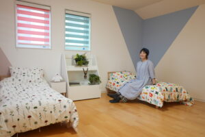 【中央棟】ママはやっぱり北欧風のおしゃれなインテリアにワクワクするかな?と思って、家具やデザインにこだわりました。(写真は子ども部屋)