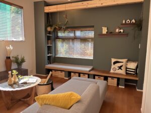 リビングには、つくり付けのベンチを配した「オキニコーナー」を設置して、子どもの遊び場や読書コーナーとして。ベンチの下にはおもちゃなど片付けボックスの収納スペースを設けています。