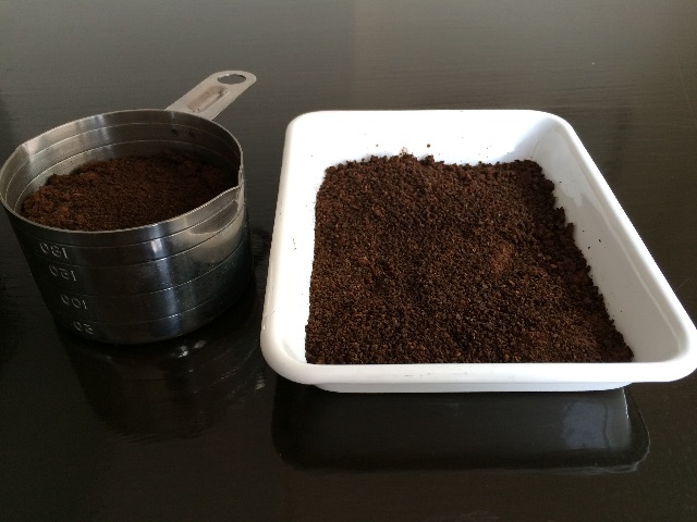 使わなくなった計量カップにコーヒーかすを入れて冷蔵庫に入れてます。