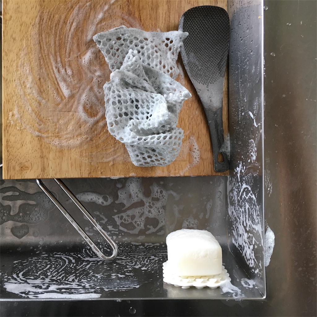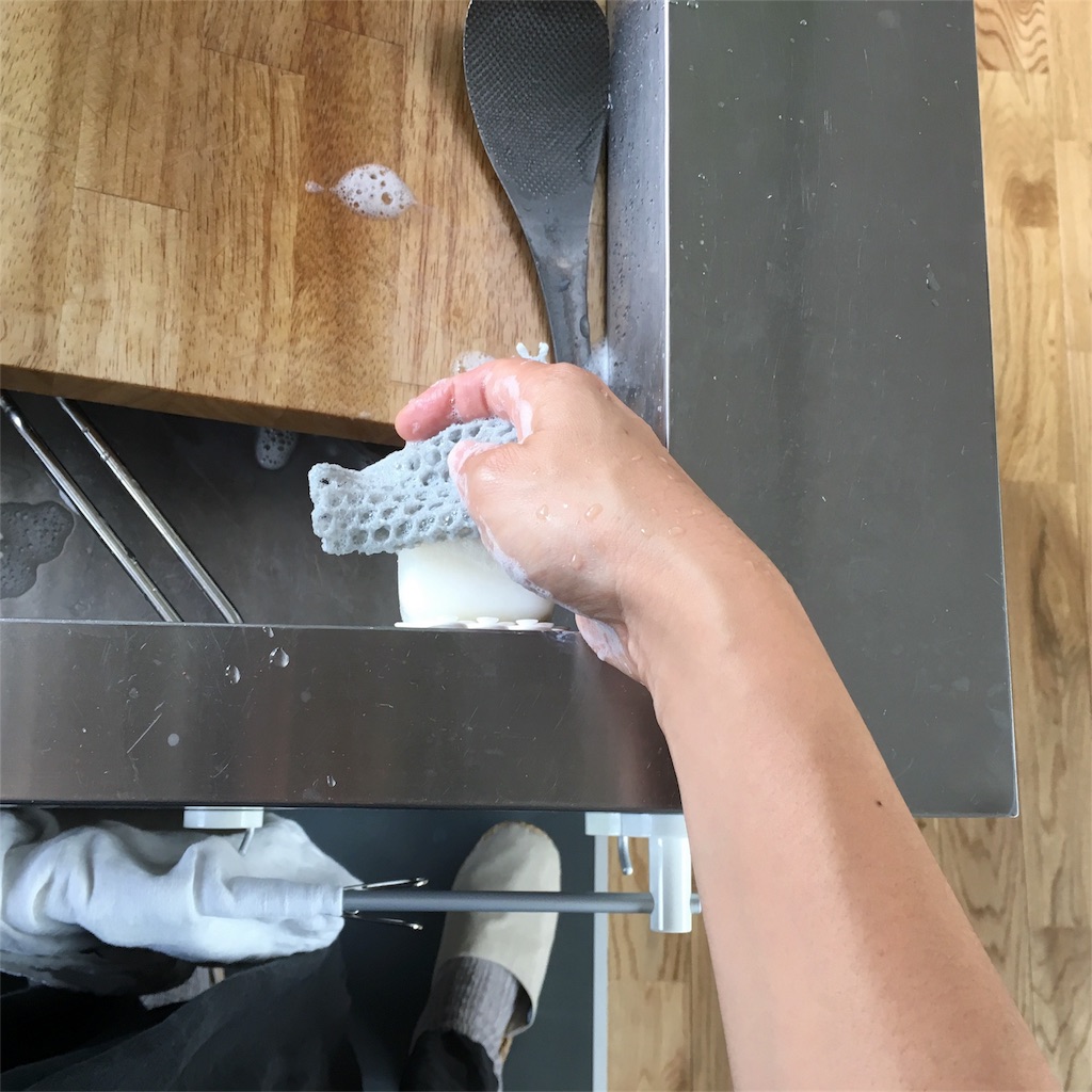 少量の液体洗剤で洗える!グラタン系のベタベタ汚れを触っても、スポンジに汚れが付着し続けない。などいい点もあるけど、手が荒れる。乾かす場所の確保が難しい。など難点もあって、この難点を解消できればな〜と思いました。