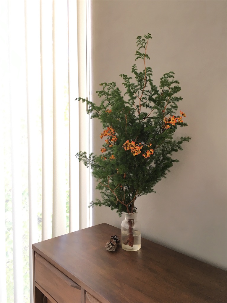 部屋中にヒムロ杉の香りがいっぱいに広がります。ウメモドキをオーナメント風にして。