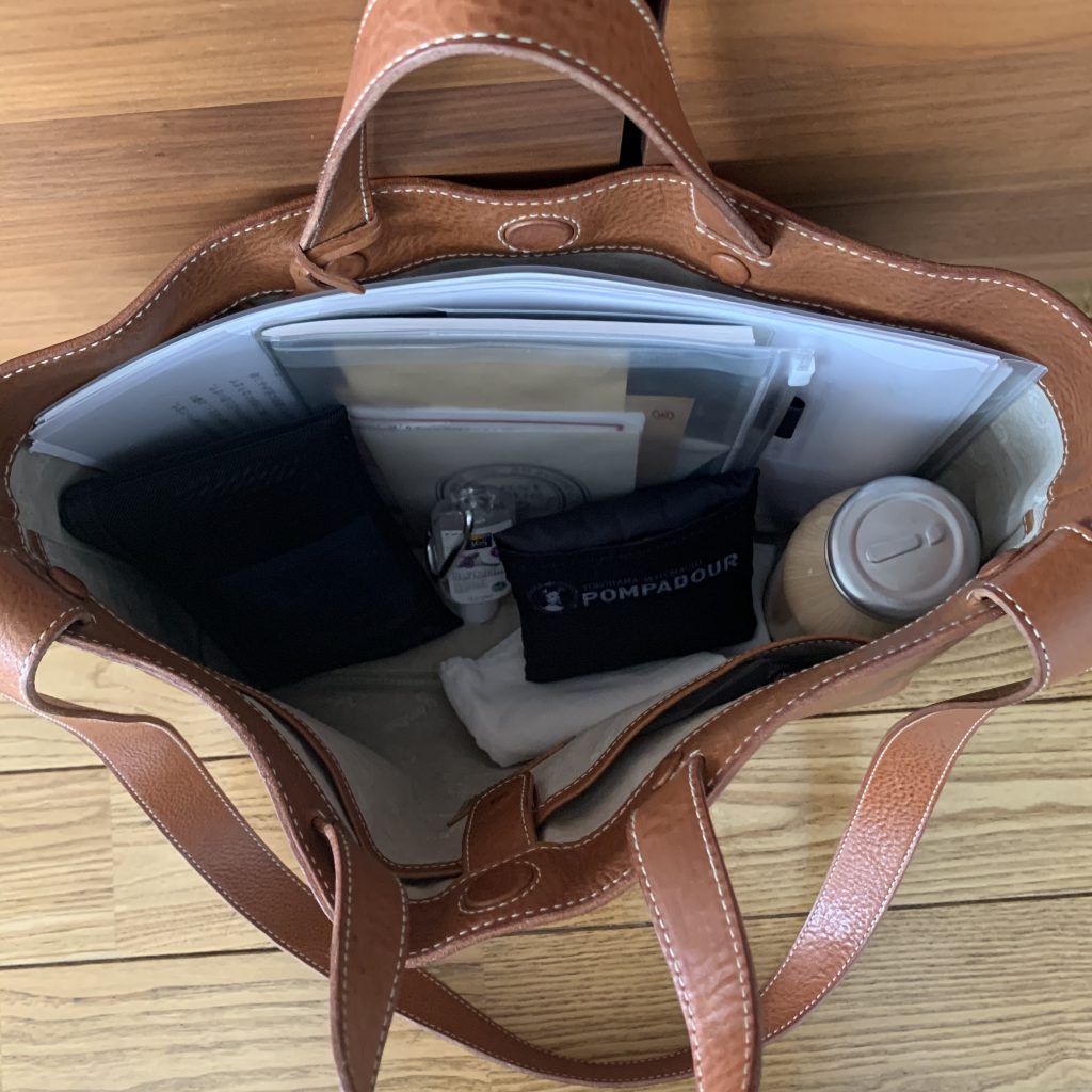 真ん中の黒い正方形がエコバッグ。どこかの付録かおまけでタダでもらったやつ。コンパクトにたためるエコバッグなので、常にバッグに入れっぱなし。