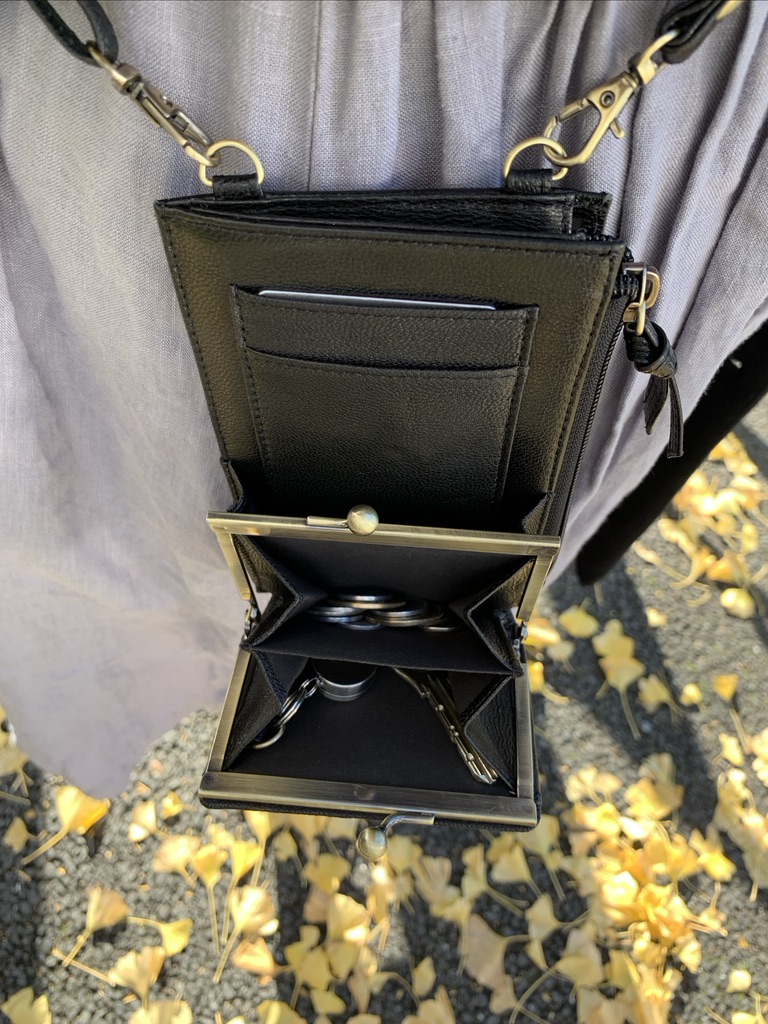 防犯上カードは見えないようになっていたり、がま口の外側にもカード入れがついてて、そこはICカードを入れたいから、絶対カードが落ちないように、1枚ギリギリ入るピッタリな設計とか。ファスナー開けやすいように同じ革でひっぱるところつけたり。小さなこだわりたくさん詰まってます!