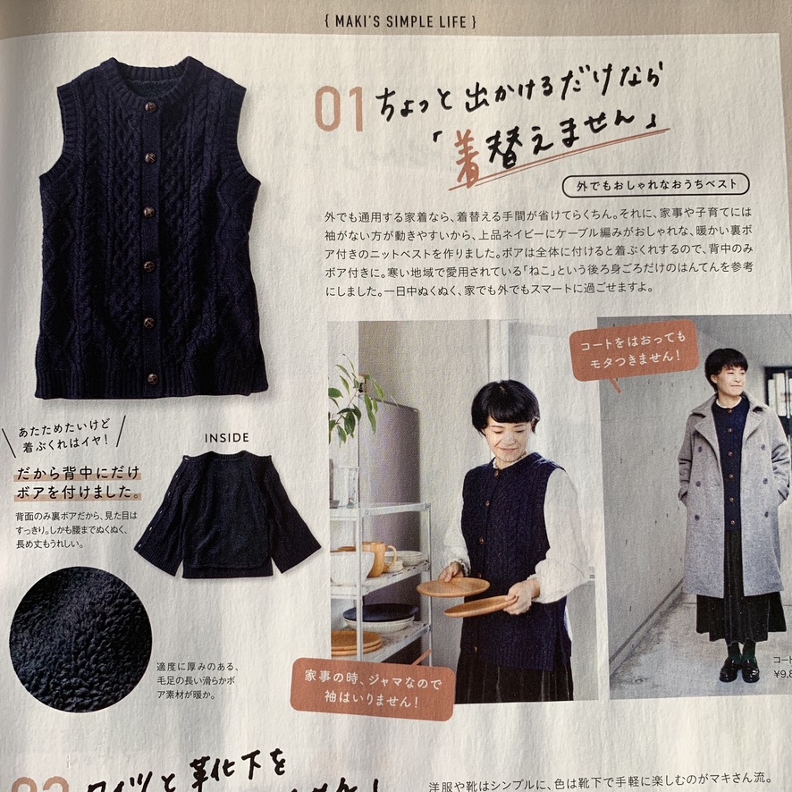 昔は家の中でダウンベストを着て家事をしてたんですが、コンロ周りで火を使うからダウンはなんとなく危ないし、動くたびにシャカシャカ音がして、家着としては不向きだよな〜と思っていて・・・
