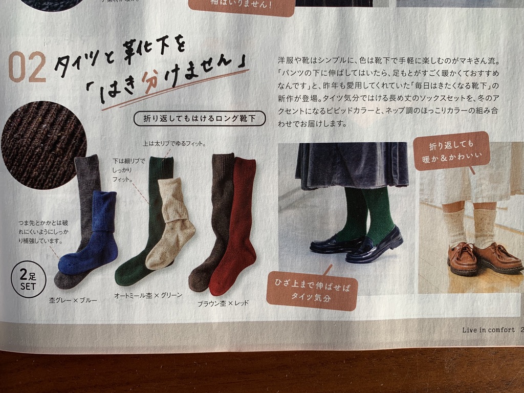 完成品が届いてからはコレしか履いてません。引き出しの中すべてこの靴下(笑)あたたかいし、去年のより進化させて毛玉ができにくくなってます。