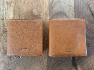 革を育てたい人は、茶かヌメ色がおすすめ。こちら左が新品、右が1ヶ月毎日使った感じ。シボ(ぶつぶつ)が消えて滑らかで艶が出てきたんです。カードのところとか、よく使ってるところに線が入ってきたり。世界でただ1つの傷やシミも経年美化ですね。