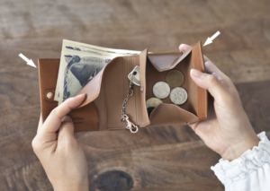 二つ折りなので、三つ折りの小さいお財布よりは大きいですが、めちゃくちゃお金の出し入れはしやすい設計にしています。
